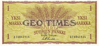 Banconota fiordistampa da 1 Marco della Finlandia, prima del passaggio in euro nel gennaio del 2002.