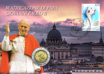 Busta PNC con moneta bimetallica fiordiconio del Vaticano con l’effige di Papa Giovanni Paolo II da Lire 500 e Francobollo commemorativo della Beatificazione con annullo speciale del primo maggio 2011.
