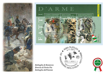 Serie di 2 foglietti su relativi bustoni FDC, dedicati alle grandi battaglie che hanno portato all'Unità d'Italia.