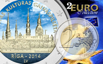 Moneta da 2 euro a colori 2014 celebrativa della capitale Riga.