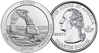 USA set 2 monete (Zecca Denver + Zecca Philadelphia) da 1 quarto di dollaro della serie "Parchi Nazionali" dedicata al Parco di Arches (Utah)