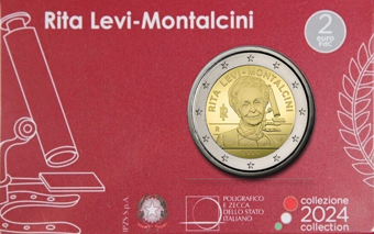 Coin card ufficiale IPZS che contiene di una moneta da 2 euro commemorativa in fiordiconio, dedicata a Rita Levi di Montalcini