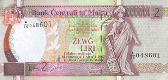 Ultima banconota da 2 Lire di Malta, prima del passaggio in euro nel gennaio del 2008. Perfetto stato fiordconio