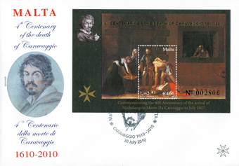 Le Poste di Malta, isola nella quale Angelo Merisi detto “il Caravaggio” fu insignito del titolo di Cavaliere di Grazia e dove dipinse alcuni dei suoi quadri più rappresentativi, ha emesso il 30 luglio 2010, in occasione del 400° anniversario della sua morte, un foglietto originario del 2007, con una sovrastampa in oro a caldo e numerazione limitata a soli 6.000 esemplari. Il foglietto è disponibile montato su busta con annullo primo giorno di emissione. Disponibilità limitatissima. |