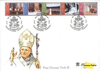 Set di 5 buste FDC con striscia da 5 valori relativa all'emissione del Vaticano da 25 valori sui corrispondenti 25 anni di Pontificato di Papa Giovanni Paolo II.
