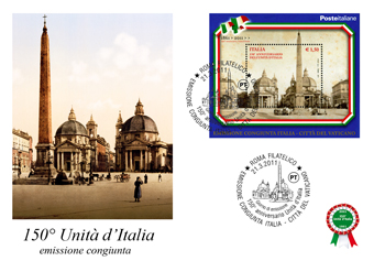 150° Unità d'Italia - EMISSIONE CONGIUNTA Italia - Vaticano, bustone con foglietto da un francobollo ed annullo primo giorno di emissione 21/3/11. ATTENZIONE: sul nostro link Veticano-Benedetto XVI francobolli è possibile acquistare l'emissione congiunta del Vaticano sul 150° dell'Unità d'Italia. |