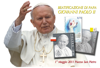 Folder illustrato che contiene la ricercata e celebre serie di 2 francobolli autentici in puro argento emessi da Vaticano e Polonia, insieme al francobollo ufficiale sempre della Città del Vaticano, dedicato alla Beatificazione del Papa del primo maggio 2011. |