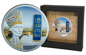 Eccezionale e autentica moneta da ben 2 once in purissimo argento, adornata con oro e palladio, coniata a rilievo ad altissima qualità, che presenta anche una gemma autentica su cui è inciso il nome di Nefertiti in geroglifico in oro a 24 karati. Un vero gioello numismatico, primo e imperdibile esemplare di una serie annuale di grande prestigio. |