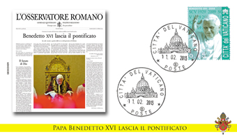 Busta filatelica con il timbro di San Pietro che riporta la data dell'11 febbraio 2013, giorno in cui Benedetto XVI ha annunciato le dimissioni dal pontificato.