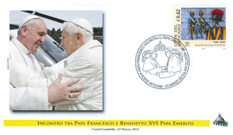 Il celebre incontro tra Benedetto XVI Papa Emerito e Papa Francesco a Castelgandolfo con annullo commemorativo speciale del Vaticano del 23 marzo 2013.