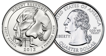 USA set 2 monete (Zecca Denver + Zecca Philadelphia) da 1 quarto di dollaro della serie "Parchi Nazionali" dedicata al Parco di Rushmore Mountain