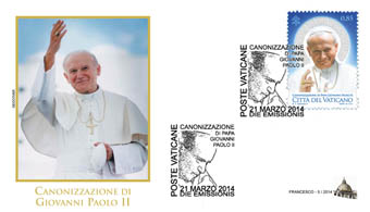 Busta FDC col francobollo del Vaticano sulla Canonizzazione di Papa Giovanni Paolo II, e annullo primo giorno di emissione del 21 marzo.