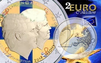 Moneta da 2 euro a colori 2014 celebrativa del cambio del trono tra Beatrice d'Olanda e William Alexander.