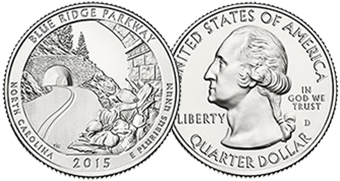 USA set 2 monete (Zecca Denver + Zecca Philadelphia) da 1 quarto di dollaro della serie "Parchi Nazionali" dedicata al Parco di Blue Ridge (North Carolina)
