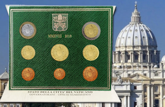 Vaticano Divisionale Euro 2018, 8 monete fior di conio in confezione ufficiale, la seconda con lo stemma pontificio al posto dell'immagine del Papa. Pontificato di Francesco.