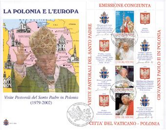 I due foglietti da 4 valori ciascuno emessi dal Vaticano (l'emissione della Polonia uscirà il prossimo giugno) su due bustoni con annullo primo giorno di emissione. 16 marzo 2003