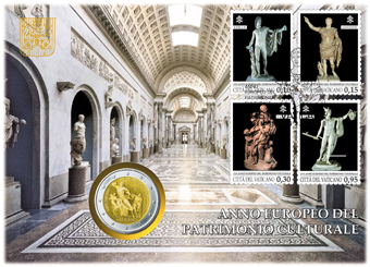 Philatelic Numismatic Cover emessa dal Vaticano che contiene l'autentica moneta da 2 euro in emissione celebrativa 2018, dedicata all'anno europeo del patrimonio culturale, su una busta filatelica che riporta i quattro francobolli dell'emissione, l'annullo primo giorno ed il foglietto speciale con logo a rilievo UFN. Disponibile dal 6 settembre 2018 |