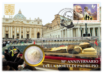 Philatelic Numismatic Cover emessa dal Vaticano che contiene l'autentica moneta da 2 euro in emissione celebrativa 2018, dedicata al 50' anniversario della morte di Padre Pio, su una busta filatelica che riporta il francobollo dell'emissione, l'annullo primo giorno ed il foglietto speciale con logo a rilievo UFN. |
