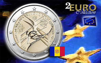 Prima emissione del 2 euro commemorativo 2019 emessa dalla Zecca di Andorra e dedicata alla Coppa del Mondo di sci apino.