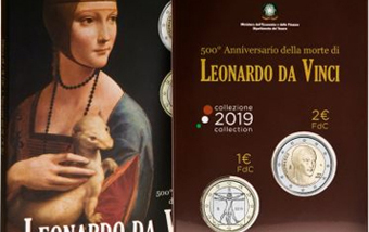 Blister ufficiale IPZS contenente il dittico con la moneta da 2 euro fiordiconio dedicata al 500' anniversario della morte di Leonardo da Vinci, e l'esemplare da 1 euro che riporta il celebre Vitruviano di Leonardo.