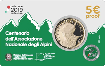 Moneta da 5 euro versione fondo specchio su coin card ufficiale IPZS e dedicata al centenario dell'associazione degli alpini.
