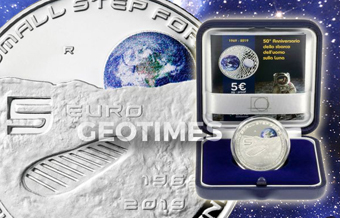 Bellissima moneta fondo specchio a colori emessa dall'IPZS, che celebra il 50° anniversario dello sbarco dell'uomo sulla luna.