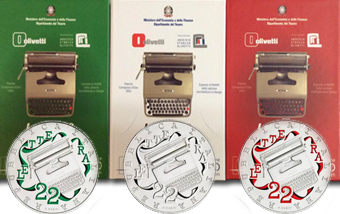 La ormai preziosa serie completa delle 3 monete in argento (colorazioni bianco, rosso e verde) sui rispettivi 3 blister ufficiali IPZS , della serie "eccellenze Italiane" e dedicate alla celebre macchina da scrivere Olivetti "Lettera 22". Pochissimi set disponibili!! |
