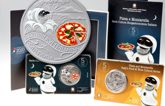 Moneta da 5 euro fiordiconio su blister ufficiale IPZS , della serie "cultura enogastronomica italiana" e dedicata alla Pizza. Pochissimi set disponibili!!