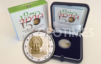 2 euro fondospecchio 2020 in cofanetto ufficiale IPZS e dedicato al 150° anniversario della nascita di Giulia Montessori