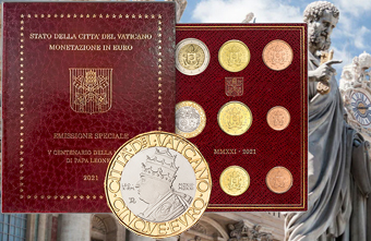 Vaticano Divisionale Euro 2021, 8 monete fior di conio in confezione ufficiale, Pontificato di Francesco, più una moneta bimetallica da 5 euro dedicata a Papa Leone X.Spedizione dal 24 maggio