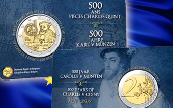 Seconda moneta da 2 euro emessa su coin card 2021, che celebra il 500º Anniversario dalle emissioni delle prime monete sotto Re Carlo V. Set completo da 2 esemplari, uno con scritte in francese e l'altro in olandese.