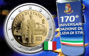 Prima emissione 2022 da parte dell' Italia di una moneta da 2 euro commemorativa, dedicata al 170' anniversario della fondzione del corpo di Polizia di Stato. Intero rotolino da 25 monete fiordiconio, in emissione speciale anticipata IPZS. (Foto fac-simile) |
