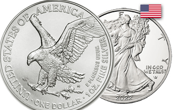 Stati Uniti - Edizione 2022 del Silver Eagle in puro argento in fiordiconio, con la nuova immagine dell'aquila che sostituisce la precedente dopo ben 35 anni.