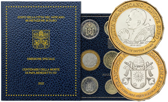 Vaticano Divisionale Euro 2022, 8 monete fior di conio in confezione ufficiale, Pontificato di Francesco, più una moneta bimetallica da 5 euro dedicata a Papa Benedetto XV.