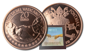 Emissione di una moneta da 20 euro in rame, dedicata all'Arte ed alla Fede - Creazione dell’uomo di Michelangelo, su cofanetto ufficiale.