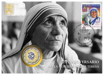 Philatelic Numismatic Cover emessa dal Vaticano che contiene l'autentica moneta da 2 euro in emissione celebrativa 2022, dedicata al 25' anniversario della morte di Madre Teresa, su una busta filatelica che riporta il francobollo dell'emissione, l'annullo primo giorno ed il foglietto speciale con logo a rilievo UFN. |