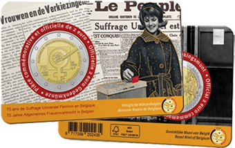 Moneta da 2 euro emessa su coin card 2023, dedicata al 75' suffragio universale femminile. Set completo da 2 esemplari, uno con scritte in francese e l'altro in olandese.