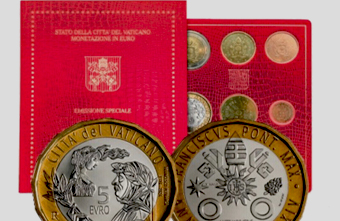 Vaticano Divisionale Euro 2023, 8 monete fior di conio in confezione ufficiale, Pontificato di Francesco, più una moneta bimetallica da 5 euro dedicata al 650° Anniversario della morte di Francesco Petrarca