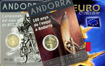 Coppia di 2 monete da 2 euro su coin card ufficiali 2024 (2 euro Mondiali di Mountaibike e 2 euro 100 anni di Sci)