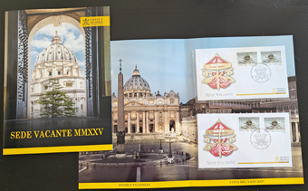 Il folder ufficiale emesso dalle Poste Vaticane e contenente la serie di 4 valori della Sede Vacante 2025 su 2 buste primo giorno di emissione.