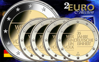 Moneta commemorativa da 2 euro edizione 2025 dedicata al 35' anniversario della riunificazione. Serie completa di tutte e 5 le diverse zecche.