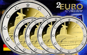 Moneta commemorativa da 2 euro 2026 dedicata alla città di Brema. Set completo di tutte le 5 monete delle rispettive zecche teesche.