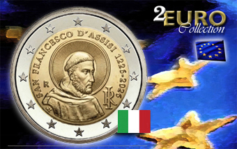 Emissione 2026 da parte dell' Italia di una moneta da 2 euro commemorativa in fiordiconio, dedicata all'800° anniversario della morte di San Francesco d'Assisi. Esemplare preso dal rotolino emesso in edizione speciale dall'IPZS. DISPONIBILE DAL 1' APRILE 2026 |