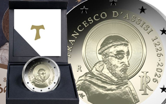 Moneta da 2 euro in prestigiosa versione REVERSE PROOF, montata su cofanetto originale IPZS e dedicata all'800' anniversario della morte di San Francesco d'Assisi