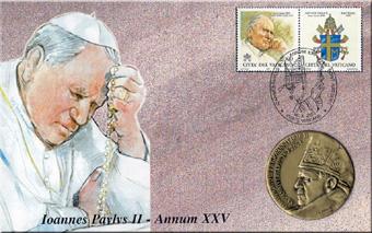 in bronzo satinato, insieme al francobollo autentico di Giovanni Paolo II con relativo timbro postale speciale, che fissano indelebilmente la data dello storico avvenimento. |