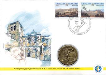 | Il viaggio in Terra Santa ha segnato una svolta epocale, e questa busta PNC celebra l'evento con 2 francobolli emessi dal Vaticano, rispettivamente Gerusalemme e Betlemme, timbrati con un annullo speciale, ed una medaglia disegnata appositamente dall'artista del Vaticano Irio Ottavio Fantini. |