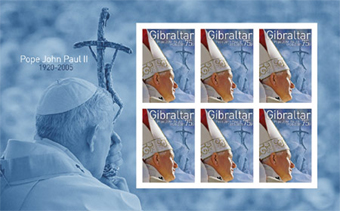 Foglietto appartenente alla serie IN MEMORIAM PAPA G.PAOLO II di 8 francobolli, emesso da Gibilterra.
