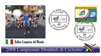 Set di 2 buste filateliche montate in folder illustrato, che celebrano attraverso il francobollo e due annulli speciali primo giorno di emissione dei Campionati Mondiali di Ciclismo Varese 2008, il trionfo azzurro di Ballan.